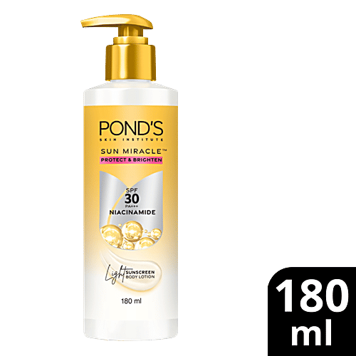 Don't let the sun steal your body's glow! Introducing Ponds Sun Miracle Light Sunscreen Body Lotion, your ultimate defense against sun damage while restoring your skin's natural radiance. With SPF 30 PA+++, it provides powerful protection against UVA and UVB rays, ensuring your skin stays safe from harmful sun exposure. Enriched with 1% active niacinamide, this innovative formula not only shields your skin but also actively works to reduce the effects of sun damage, diminishing tan lines in just 7 days. Say hello to brighter, more radiant skin. Ponds Sun Miracle Light Sunscreen Body Lotion is your perfect companion for sun-kissed adventures. Its lightweight, non-greasy formula ensures effortless application, leaving no white cast and providing transfer-proof protection. So you can enjoy outdoor activities without worrying about heavy or sticky residue.