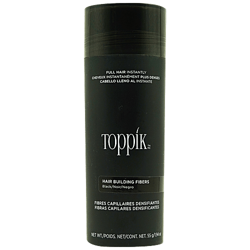 Toppik Hair Building Fibers Black. Made of natural, coloured Keratin protein that is statically charged, Toppik Fibers intertwine with your existing hair for a completely natural look. Toppik resists wind, rain, and perspiration but removes easily with shampoo.